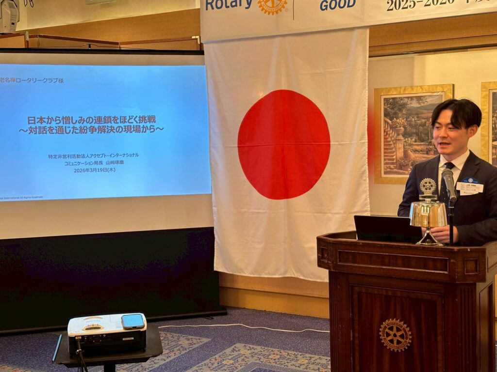 本日は貴重な機会をいただき、ありがとうございます。NPO法人アクセプト・インターナショナルの山崎琢磨です。実は先月も海老名のクラブで卓話をさせていただきましたが、今回こちらに伺ったのは不思議なご縁があったからです。